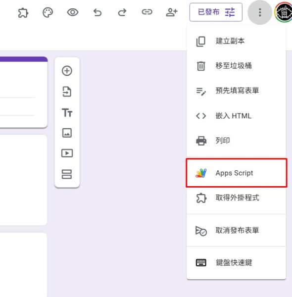 第1步,在表單的功能選單,將表單連結至Google Apps Script