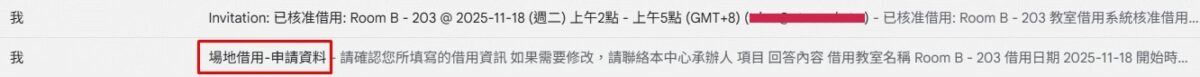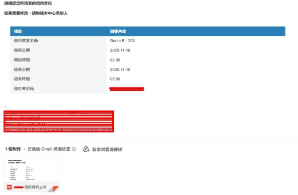 這樣借用人送出表單之後,就會收到通知信跟附件
